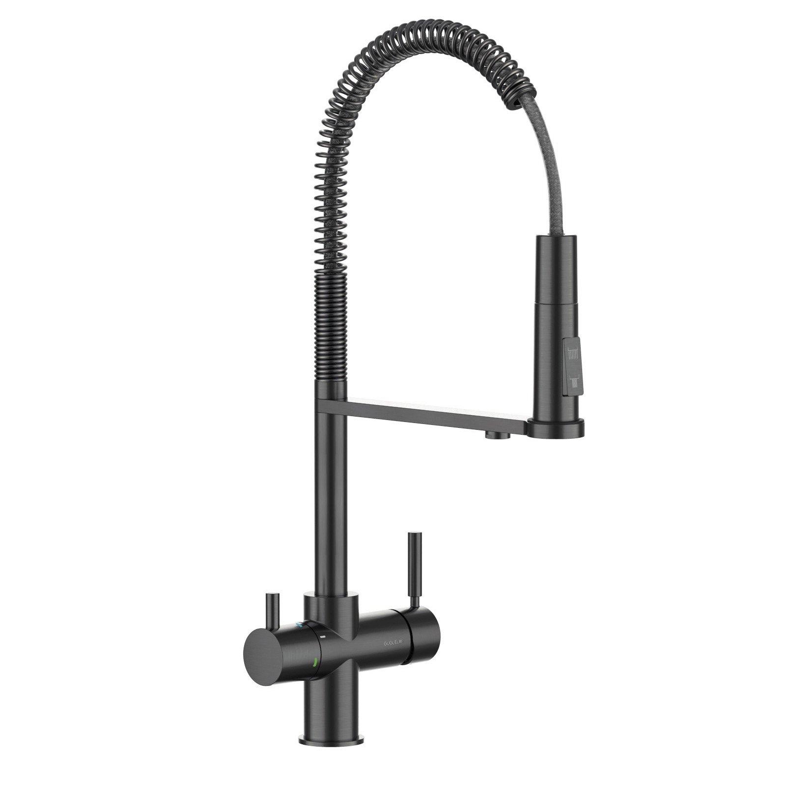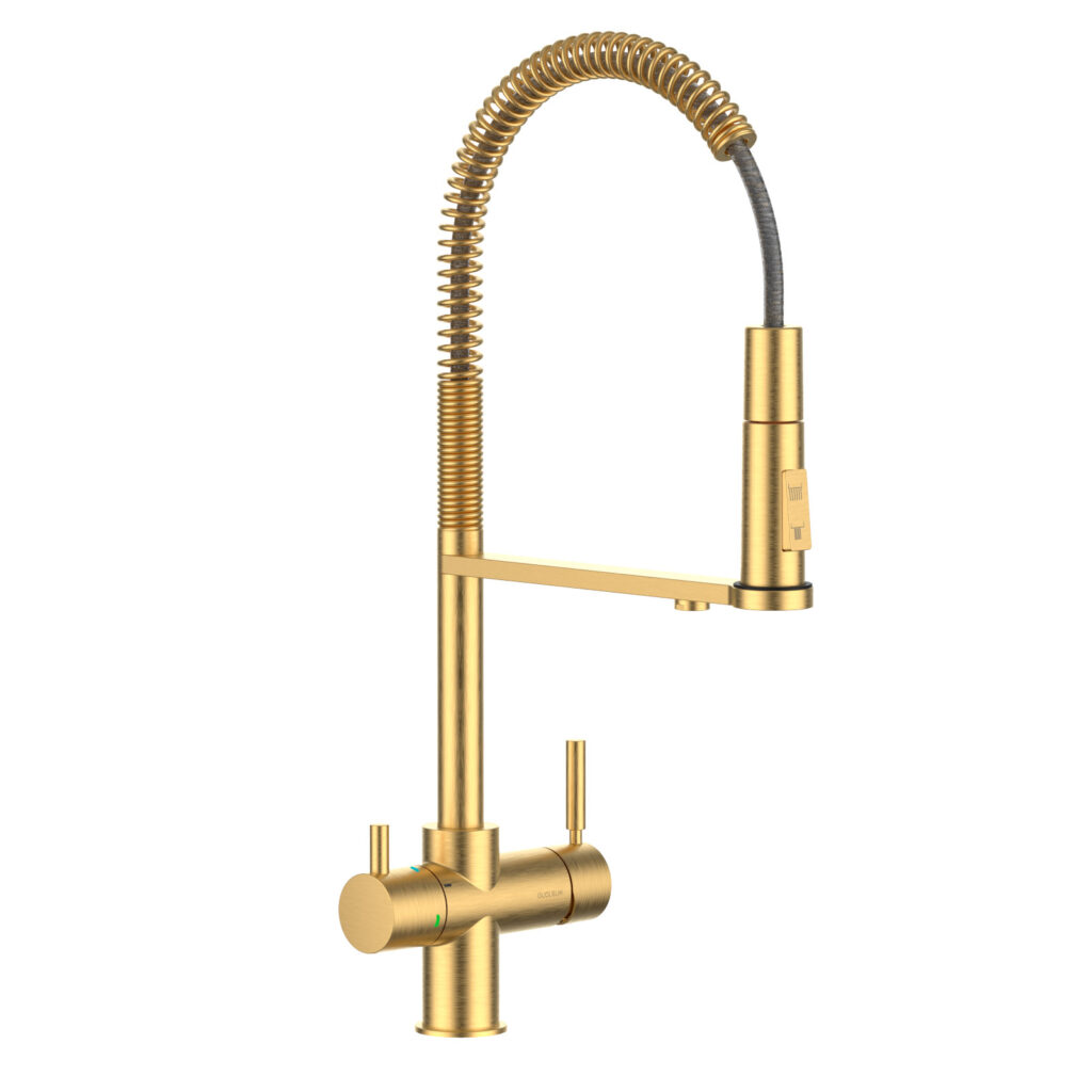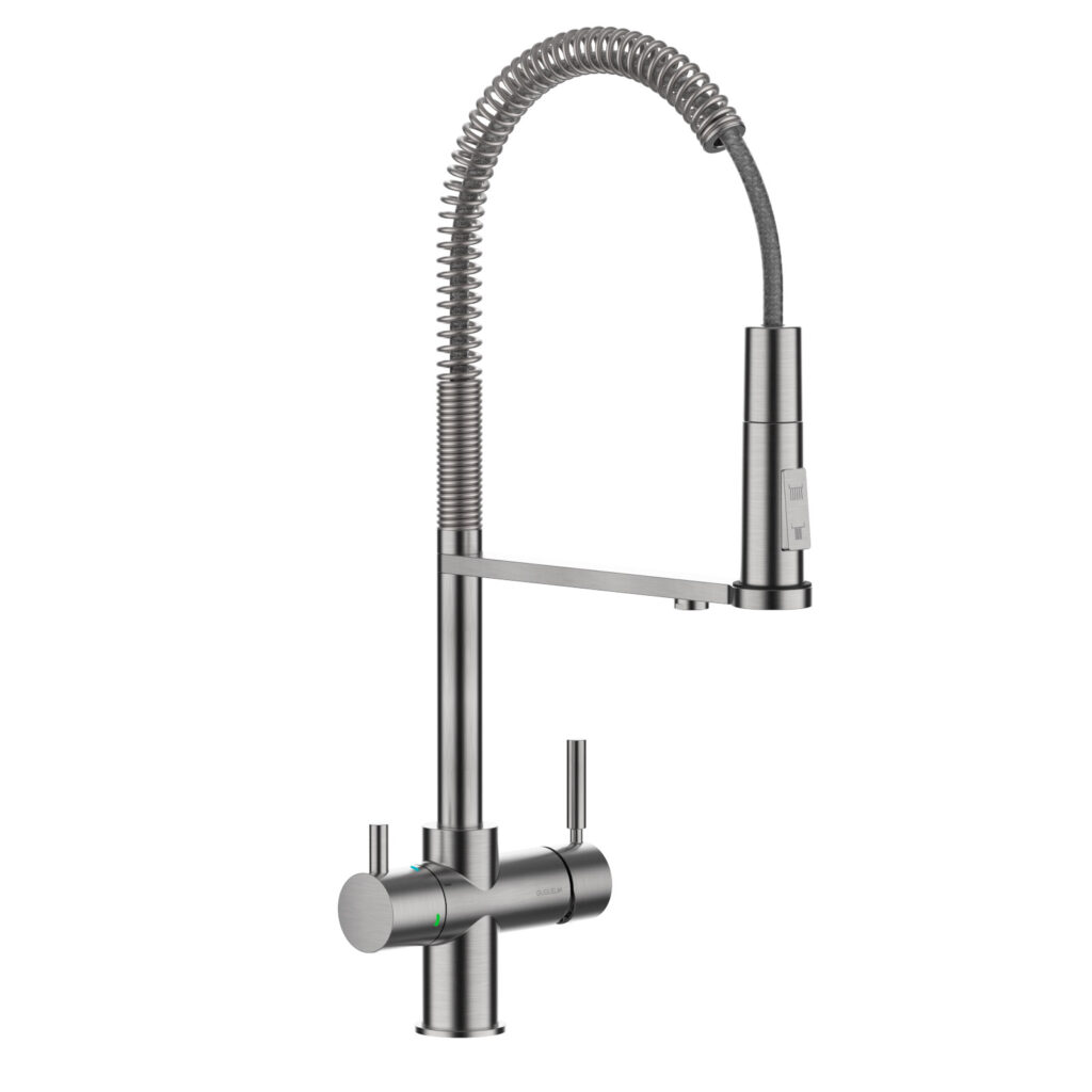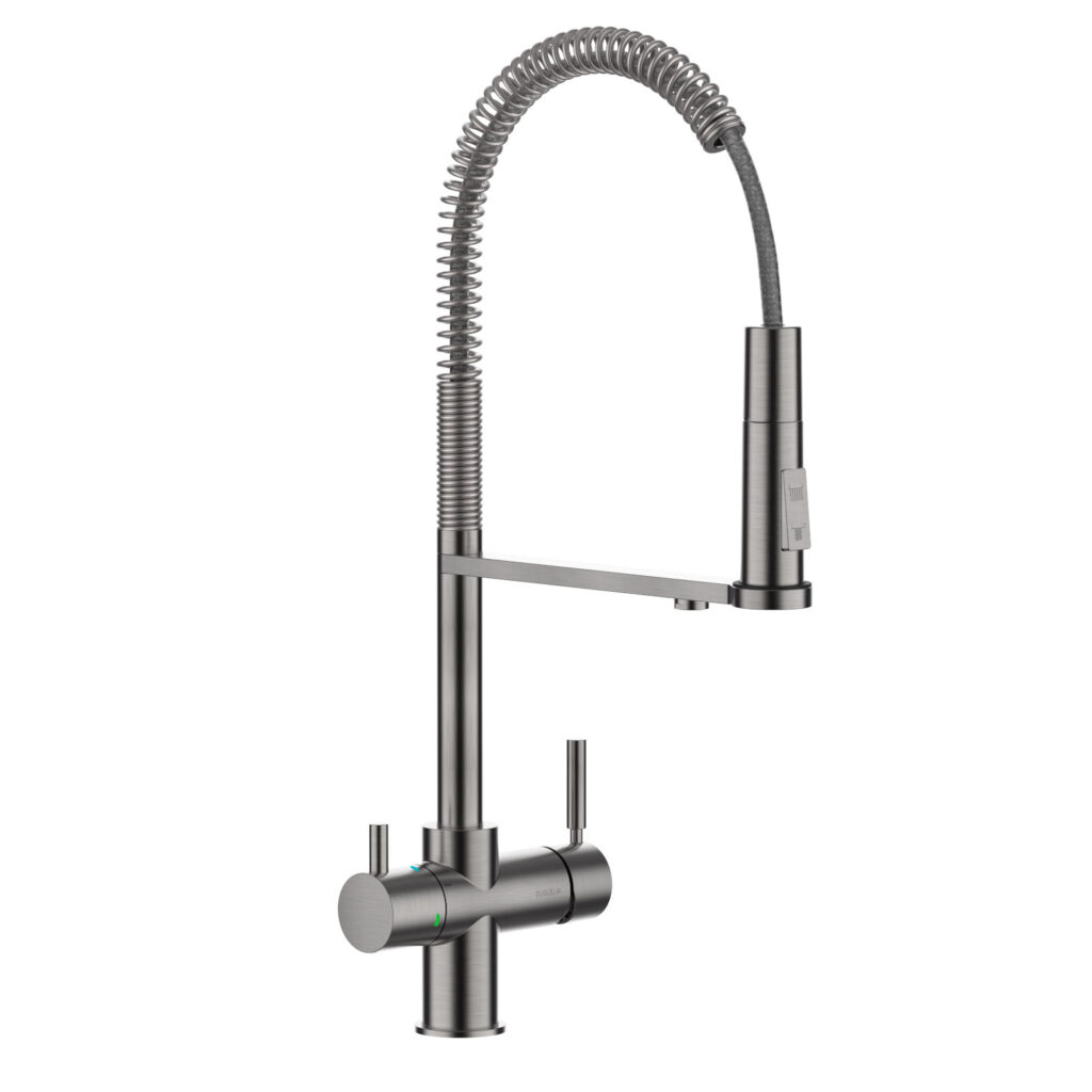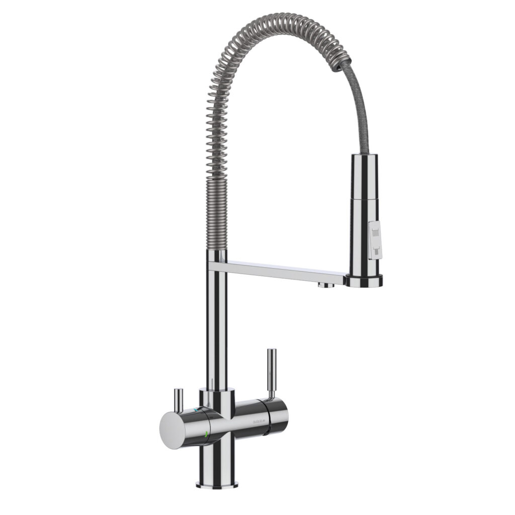 De Industrial Spring is een multifunctionele designkraan met aparte uitgangen voor enderzijds warm en koud leidingwater en anderzijds gefilterd plat en bruisend water. De gebruiksvriendelijke douchette doet dienst voor de huishoudelijke taken terwijl de brug heelijk drinkwater voorziet.